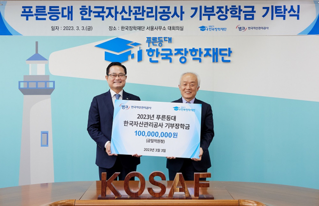 한국장학재단(이사장 배병일)과 한국자산관리공사(사장 권남주)가 3일 한국장학재단 서울사무소에서 푸른등대 한국자산관리공사 기부장학금 기탁식을 개최했다.
