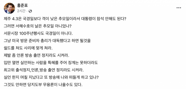 홍준표 대구시장이 제주 4·3 추념식에 대해 '격이 낮은 기념일'이라고 발언한 김재원 국민의힘 최고위원을 두고 "제발 좀 언론 방송 출연 정지라도 시켜라"고 4일 말했다.
