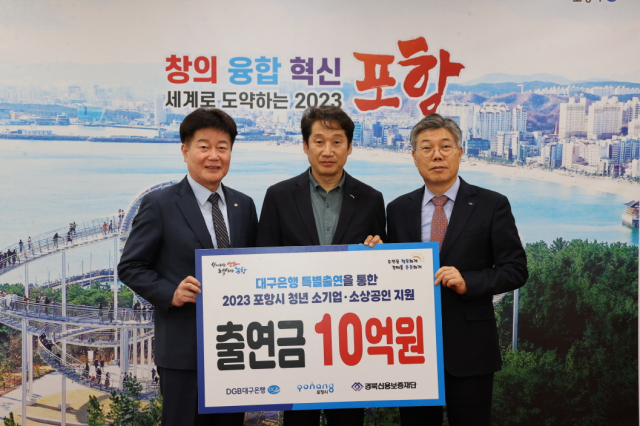 10일 포항시에 따르면 시청 대외협력실에서 김남일 포항시 부시장, 황병우 DGB대구은행장, 김세환 경북신용보증재단 이사장이 참석한 가운데 ‘포항시 청년 소상공인 창업지원 업무협약’을 체결했다.