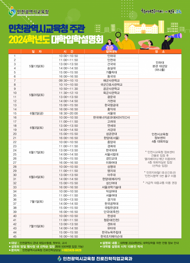 인천지역 대학을 포함한 총 45개 대학을 초청해 열리는 이번 입학설명회에서는 각 대학별 입학사정관이 직접 2024학년도 대학 수시모집과 정시모집의 주요 변경사항 등 대입 수험생에게 꼭 필요한 정보들을 제공할 예정이다.