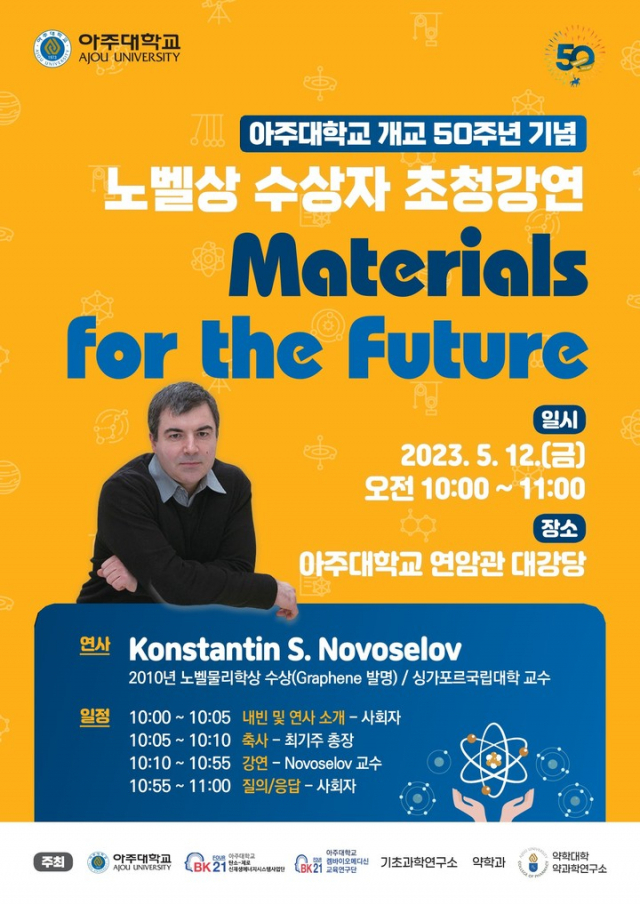 아주대는 오는 12일 노벨 물리학상 수상자인 콘스탄틴 노보셀로프(Konstantin Novoselov) 싱가포르국립대학 교수를 초청해 ‘미래를 위한 물질’을 주제로 강연을 진행한다.