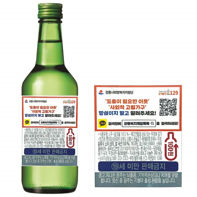 롯데칠성음료 강릉공장은 10월부터 업소용 소주 ‘처음처럼’ 30만 병에 ‘위기가구·사회적 고립가구 신고 및 도움요청 방법’을 홍보할 주류백라벨을 부착하여 사회적 고립가구에 대한 관심 제고에 나선다.