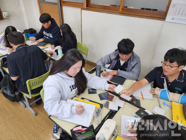 ‘별과 우주’ 단원에 대한 이날 수업에서 학생들은 3∼4명씩 모둠을 구성한 뒤 저마다 천문학자의 입장에서 여러 성단과 성운 등이 담긴 20장의 사진을 두고 각각 비슷한 특징을 가진 것끼리 묶은 뒤 △천체 그룹화하기 △천체 특징 적기 △천체 관련 정보찾기 등 3가지 과제를 해결하기 위해 토론과 교과서 또는 태블릿 PC를 이용하거나 교사의 도움을 받으면서 그룹별 특성을 탐구했다.