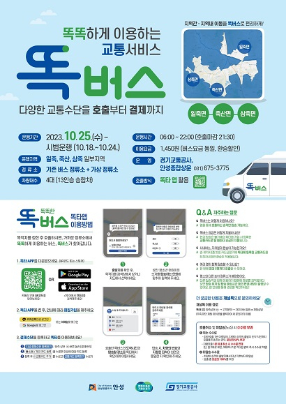 경기도와 경기교통공사는 18일부터 일주일간 안성지역 똑버스에 대한 시범 운행을 진행한 뒤 25일부터 총 8대로 정식 운행을 시작한다고 17일 밝혔다.