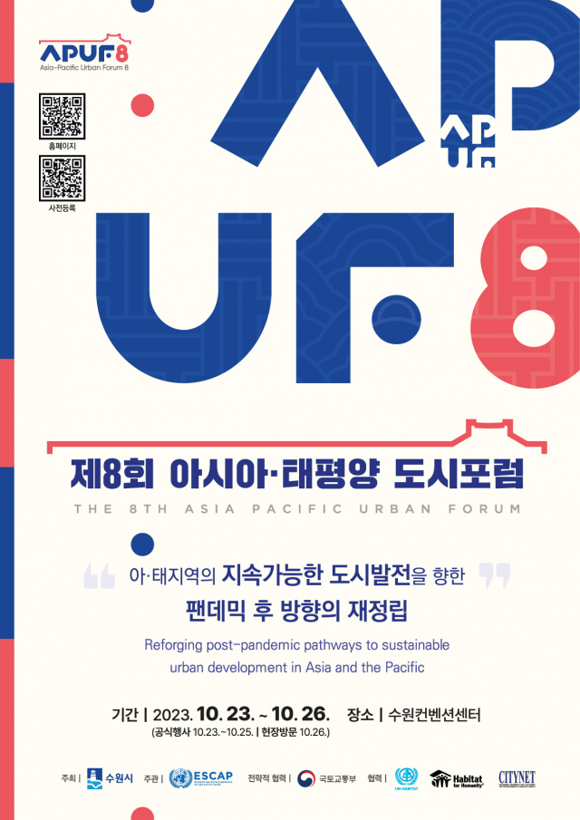 17일 시에 따르면 오는 23일 아시아·태평양 지역의 지속가능한 발전 방향을 정립하기 위한 ‘제8회 아시아태평양도시포럼(APUF-8)’이 수원에서 개최된다.