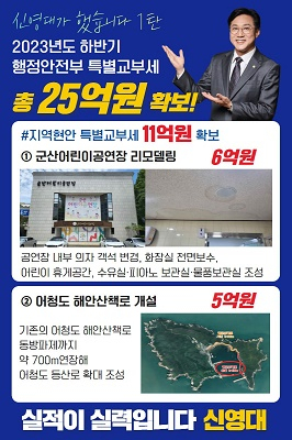 신영대 의원에 따르면 행정안전부로터 ▲군산 어린이 공연장 리모델링 공사 6억 원 ▲어청도 해안산책로 개설 사업 5억 원 등 지역 현안 사업 2건에 대해 11억 원의 특교세가 확보돼 투입될 예정이다.