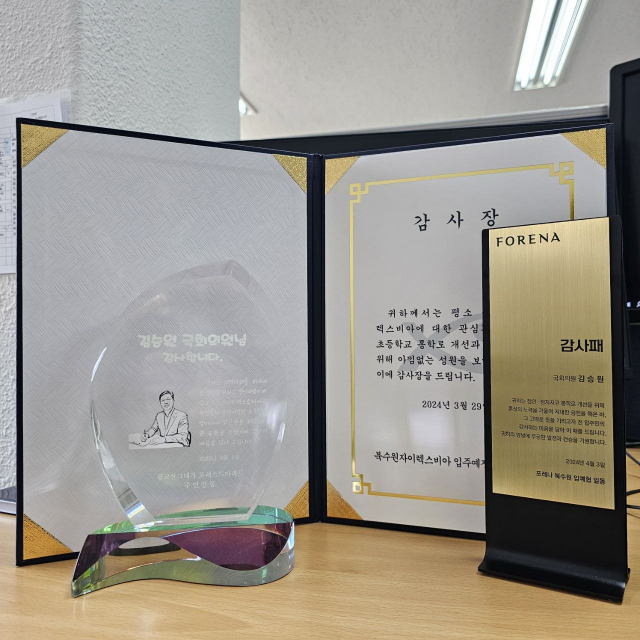 4일 김 의원 측에 따르면 지난해와 올 3월 입주가 시작된 북수원지역 2개 아파트 단지 입주예정자협의회는 최근 김 의원에게 감사장과 감사패를 잇따라 수여했다.