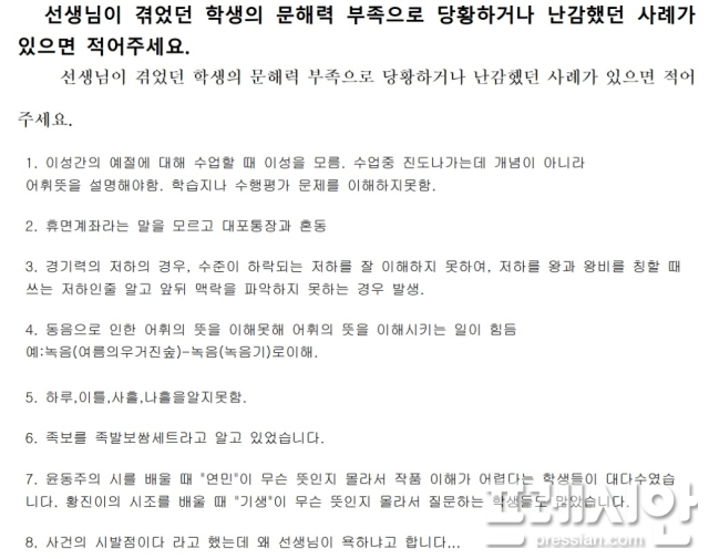 경기지역 교사들이 학생들의 낮아진 문해력에 대한 우려의 목소리를 제기했다.