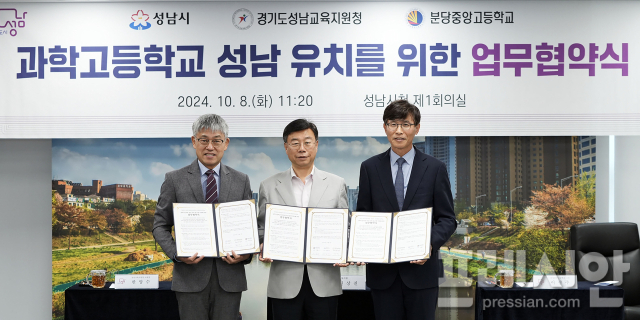 신 시장은 "성남교육지원청 및 분당중앙고와 함께 과학고의 성남 유치를 위해 첫 발을 내딛은 뜻깊은 자리"라며 "3자 협약을 통해 적극 소통하면서 남은 기간 경기형 과학고 공모서 작성에 총력을 기울이자"고 말했다.