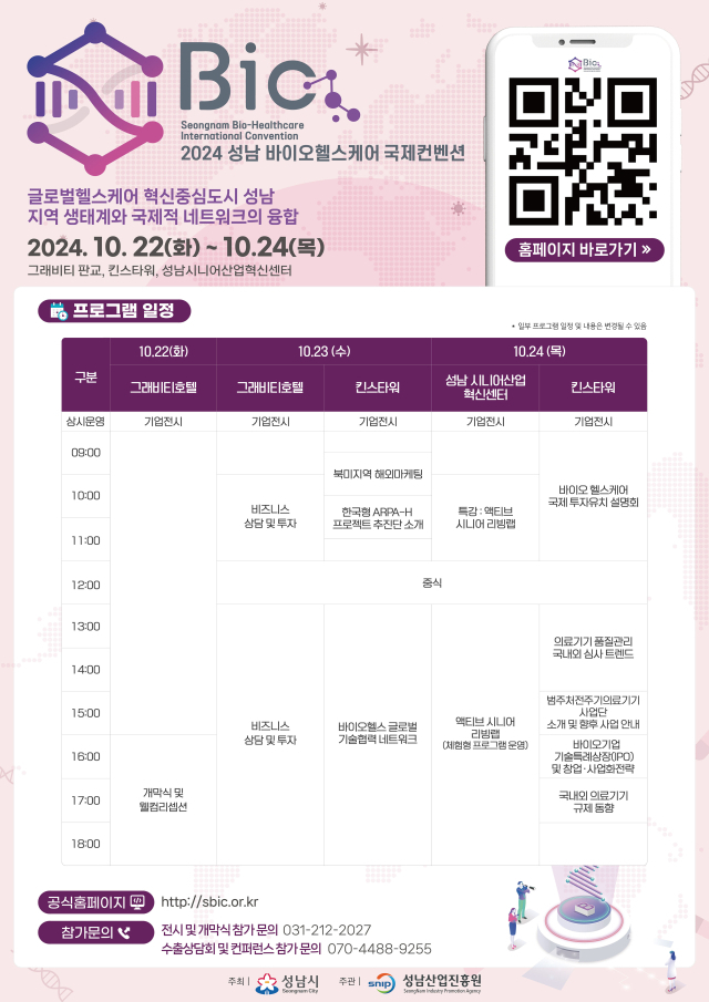 오는 24일까지 판교 그래비티 호텔과 킨스타워 및 시니어산업혁신센터 등지에서 펼쳐지는 이번 국제 컨벤션은 1800여 개 의료기관과 2만여 명의 의료 인력 및 930여 개 바이오헬스케어 기업 등 성남지역의 의료 인프라와 관련 기술을 전략적으로 알려 세계화를 추진하기 위한 것이다.