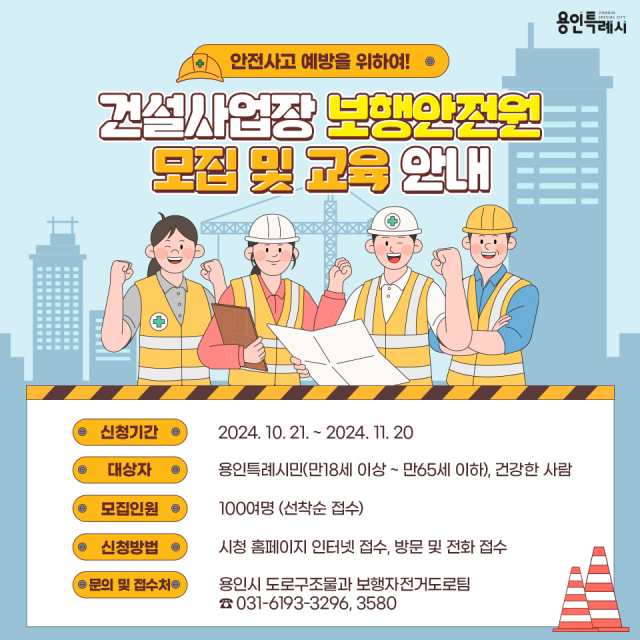 용인특례시는 건설사업장 주변을 통행하는 시민의 안전을 지키기 위한 ‘보행안전원’을 모집한다고 20일 밝혔다.