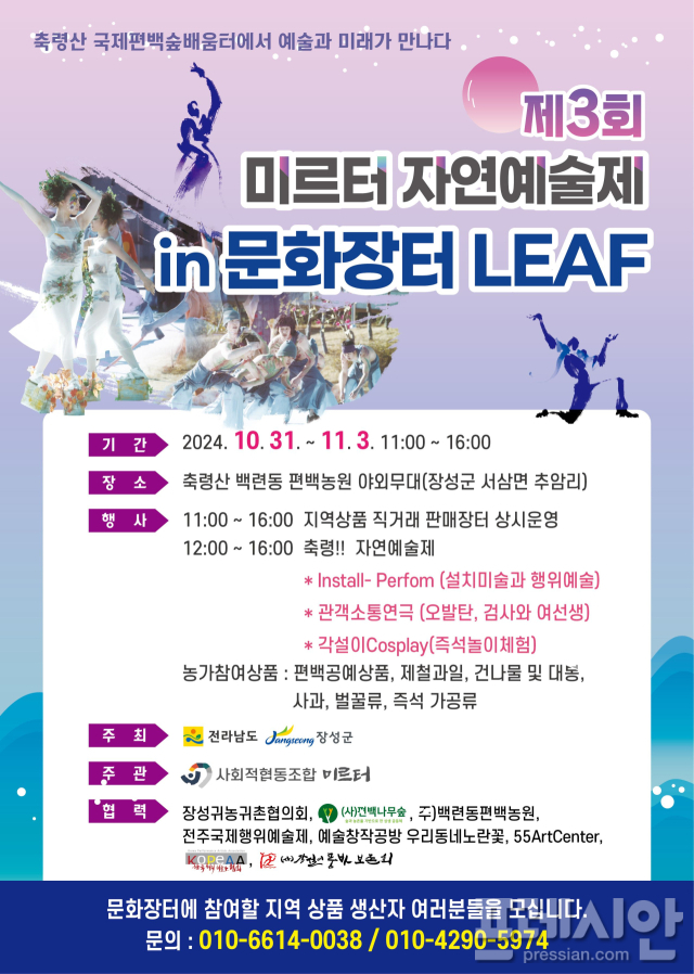전남도와 장성군이 주최하고 장성지역 사회적협동조합 미르터가 주관하는 이번 자연예술제는 '장성의 자랑' 축령산 편백숲을 배경으로 펼쳐지는 문화·예술 향연이다.