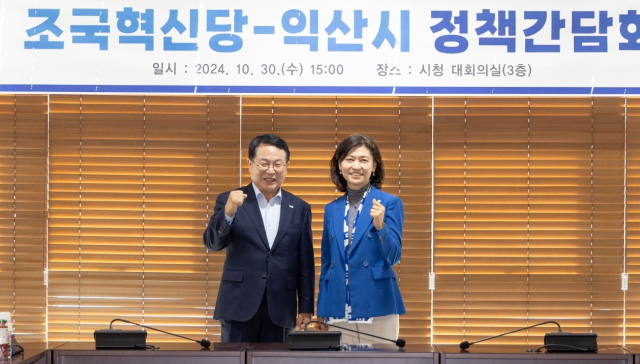 전북특별자치도 익산시와 조국혁신당이 30일 시청 대회의실에서 가진 정책간담회 자리에서 정헌율 익산시장과 강경숙 조국혁신당 의원(비례)이 서로 상찬하는 풍경이 연출됐다.