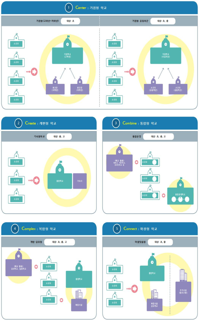 초·중학교가 대상인 ‘거점형(Center)’은 거점학교를 중심으로 주변 소규모 학교를 통합 운영하는 형태이며, 중·고교가 대상인 ‘개편형(Create)’은 소규모 학교를 기숙형학교(특성화고 등) 또는 분교장으로 개편하는 것이다.