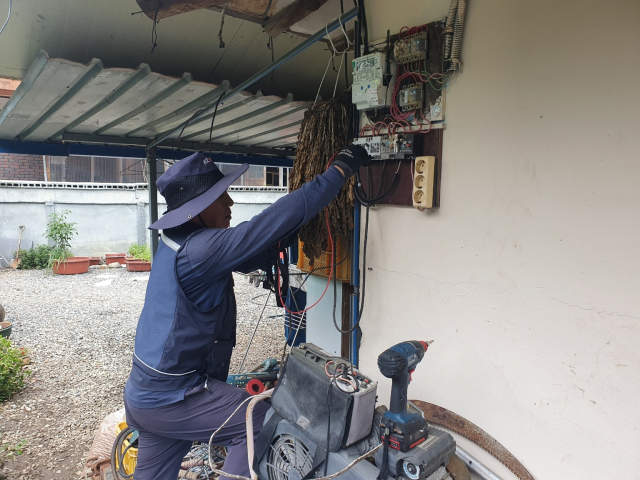 ▲한국전기안전공사 청년자율방재단 관계자가 지난 7월에 전북 완주군 침수 현장에서 전기설비 복구작업을 진행하고 있다. ⓒ한국전기안전공사