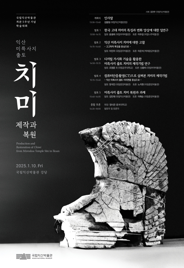또 '컴퓨터단층촬영(CT)으로 살펴본 치미의 제작기법 -익산 미륵사지 출토 치미편을 중심으로-(국립중앙박물관 양석진)'와 '미륵사지 출토 치미 복원과 과제(국립익산박물관 김민재)' 등의 순으로 발표가 이어진다.