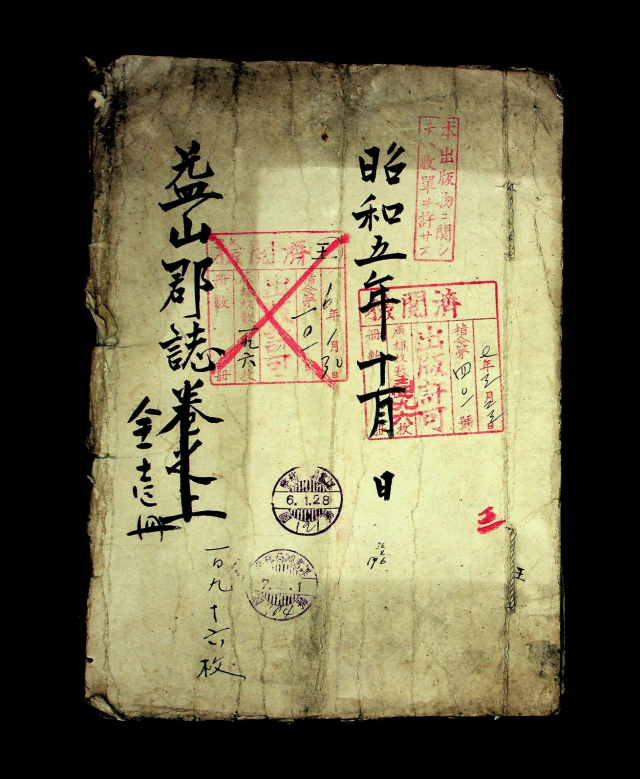28일 익산시에 따르면 1930년대에 조선총독부 경무국에서 출판인쇄물을 검열하는 과정에서 통과하지 못한 '익산군지(益山郡誌)' 검열본을 보면 책 표지에 빨간색의 굵은 'X'자를 표시해 반려된 인쇄물임을 나타냈다.