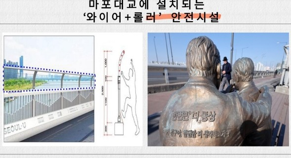 송영자 의원은 관할 구역을 명확히하고 자살 수단 접근을 제한한 키 높이의 난간 펜스 설치와 난간 윗부분의 롤러 설치 등 사람들이 자살을 시도하기 어렵게 만들어 골든타임 내 구조하는 방법 등을 제안한다고 말했다.
