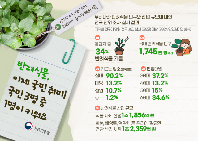 그 결과 반려식물을 기른다고 답한 응답자는 34%를 차지했다. 지역별 인구에 비례해 환산하면 국내 반려식물 인구는 약 1745만 명으로 추산된다.