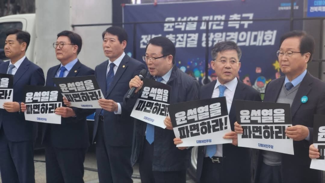 정헌율 전북자치도 익산시장이 12일 더불어민주당 전북자치도당이 주최한 '윤석열 파면 촉구 전북 총집결 당원 결의대회'에 참여해 "대한민국이 진정한 법치와 정의를 되찾을 때까지 싸울 것"이라며 윤석열 대통령의 파면을 강하게 촉구했다.