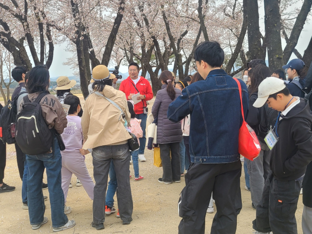 봄바람에 벚꽃이 흩날리는 왕궁리 유적지의 절경을 즐기며 가족단위의 참가자들은 서로 상의하며 게임과 같은 프로그램에 열중했다.