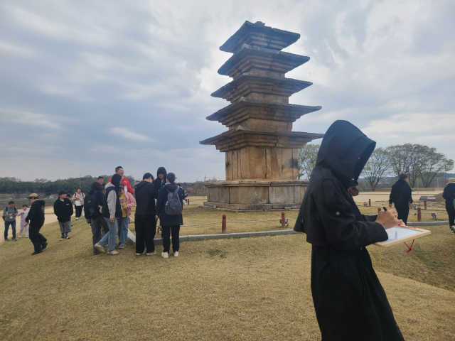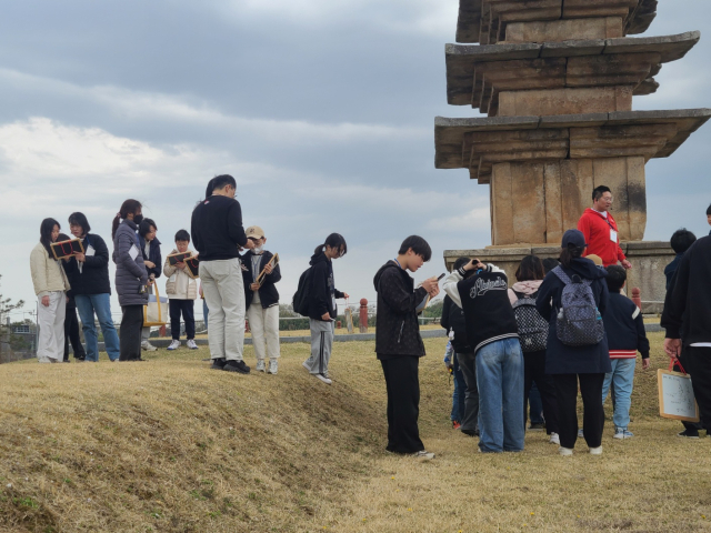 아이들은 자신의 보폭을 잰 후 전북자치도 익산시 왕궁면의 '왕궁리5층석탑'을 한 바퀴 돌았다.