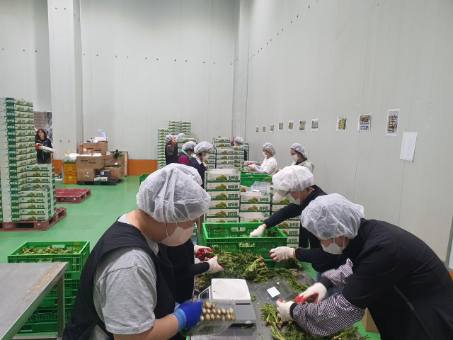 28일 장수군에 따르면 봄철을 대표하는 산나물인 두릅을 공동선별해 본격적인 출하를 시작했다.