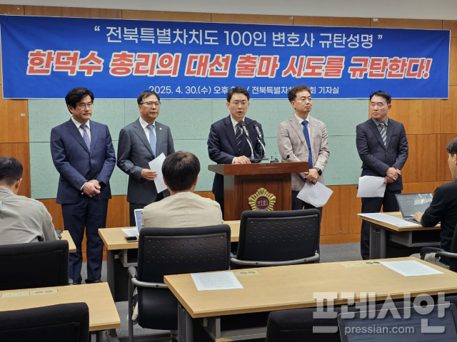 전북지역 변호사 100명은 지난달 30일 전북자치도의회에서 공동 기자회견을 하고 한 총리의 대선 행보를 비판하는 성명서를 발표했다.