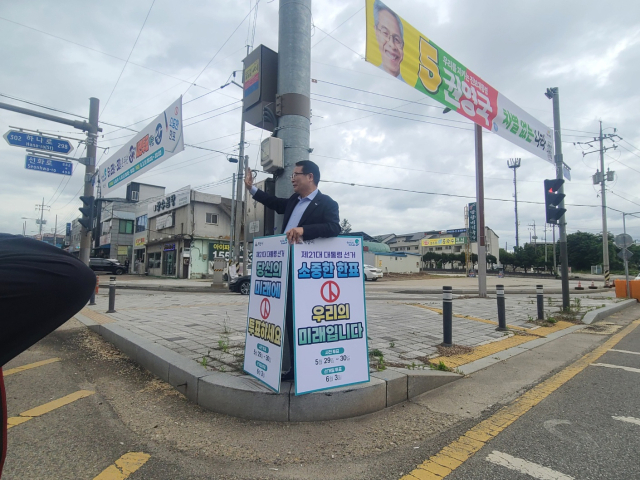 정헌율 전북자치도 익산시장이 16일 오전 8시 출근길에 단체장이 아닌 개인 신분으로 익산시 중앙체육공원 장수곰탕 사거리에서 시민들의 투표참여를 독려하는 '무언의 1인 호소'에 나섰다.
