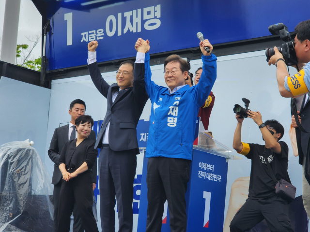 이재명 후보는 이날 예정시간인 20분을 훌쩍 넘겨 45분의 유세를 하고 "이 자리에서 여러분께 소개해 줄 분이 계시다"며 김 의원을 유세차량 위로 불러 마이크를 넘겼다.