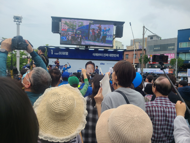 이재명 후보의 유세는 이날 오전 11시부터 45분간 이어졌다. 당초 일정은 20분으로 잡혀 있지만 지지자들을 향해 "여러분, 시간이 좀 되십니까?"라며 다시 말을 이어가 연설 시간은 2배로 늘었다.
