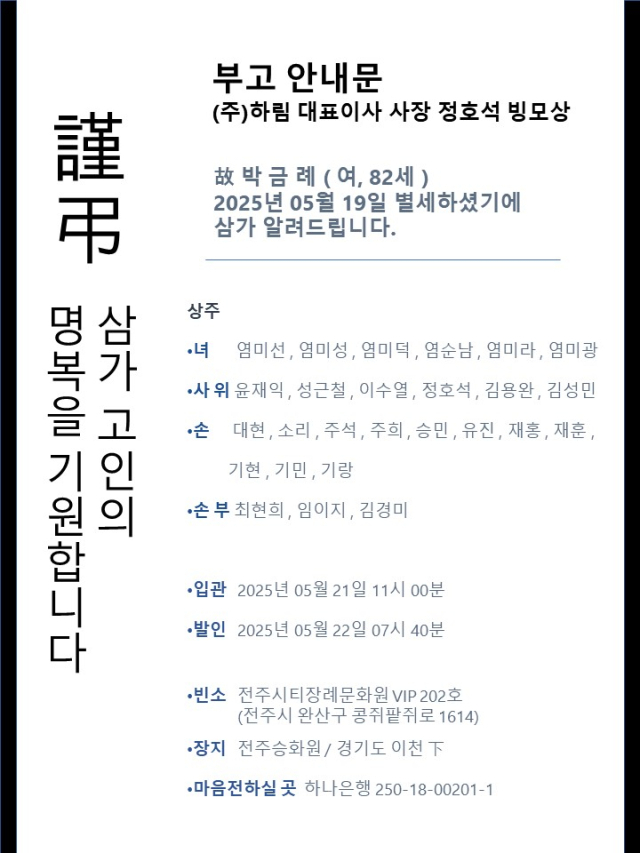 ◆ 정호석(㈜하림 대표이사)씨 빙모상 =박금례씨 별세, 정호석(㈜하림 대표이사)씨 빙모상, 20일, 22일 오전 7시40분 발인, 전주 승화원, 경기도 이천, 전주시티장례문화원 VIP202호.