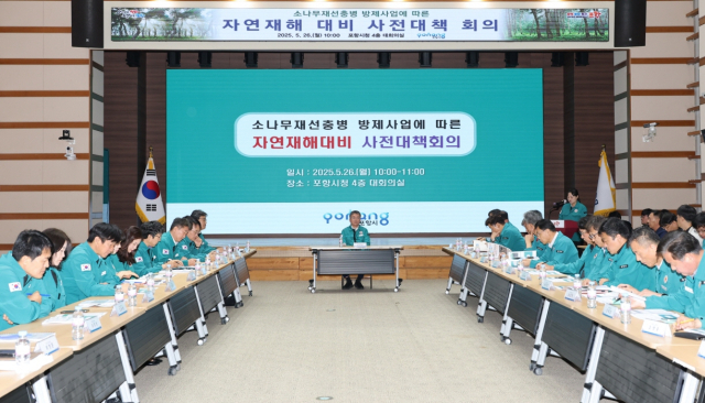 경북 포항시가 26일 시청 대회의실에서 소나무재선충병 방제사업지의 자연재해 위험 요소를 점검하고, 우기 및 태풍에 대비한 선제 대응 방안을 논의하는 사전대책 회의를 열었다.