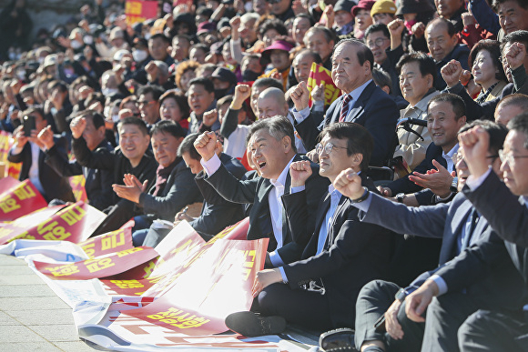 전북 국회의원들이 전원 참석한 이날 궐기대회에서는 "새만금 예산삭감은 전북도민들의 자존심을 짓밟은 것"이라는 정부와 기재부 성토 목소리로 하늘을 뒤덮었다.