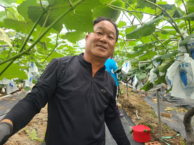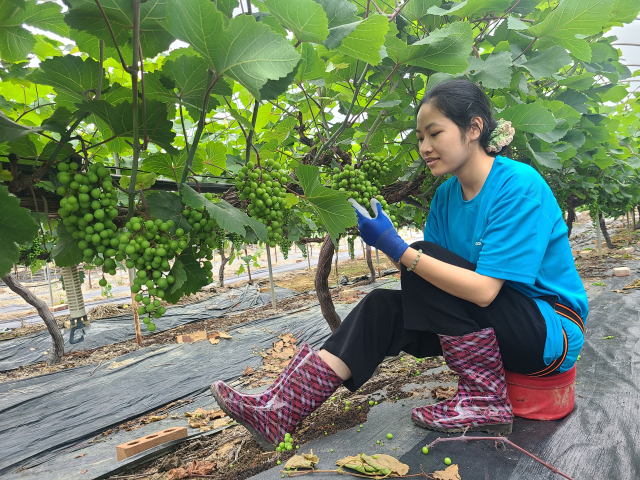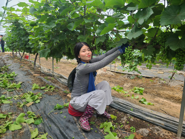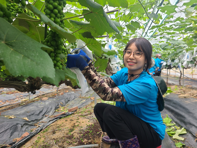미얀마 출신인 그는 전날부터 전북국제협력진흥원의 외국인 유학생 농촌일손돕기 프로그램에 참여한 덕분에 익숙하게 포도 알 솎기 작업을 하며 땀을 흘렸다.
