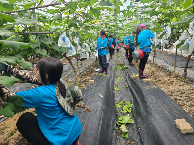 베트남과 미얀마, 중국, 파키스탄 등 여러 나라에서 유학 온 이들은 포도 알 솎기와 순 따기, 봉지 씌우기 등에 바쁜 일손을 움직여 전체 3000평 중 1000평의 일거리를 마무리했다.