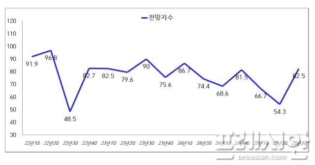 이번 전망지수(82.5p)는 2025년 2/4분기(54.3p) 대비 28.2p 상승했지만, 15분기(22년1분기~25년3분기) 연속 100 이하를 기록했다. 전국 기준은 80.7p이며 전남 기준 83.3p였다.