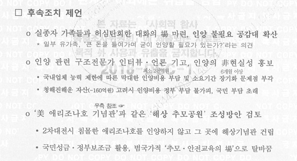 왜? 이렇게까지 문제점을 부각시키면서 인양을 하지 않으려고 했을까? 기무사 문건을 보면, 인양에 대한 막대한 비용과 국민부담을 초래한다는 걸 인양 관련 구조 전문가 인터뷰, 언론 기고를 통해 홍보하고, 애리조나호 기념과 같은 추모공원 조성을 제시 시간을 벌고 논점을 흐리려는 걸 알 수 있다.