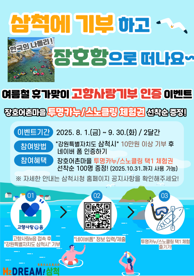 이번 이벤트는 이벤트 기간 내 삼척시에 10만 원 이상 기부하고, 네이버폼을 통해 기부 인증을 완료한 선착순 100명에게 장호어촌체험마을 투명카누(4인승) 또는 스노클링(2인) 체험권 1매를 모바일티켓 형태로 제공하는 행사다.