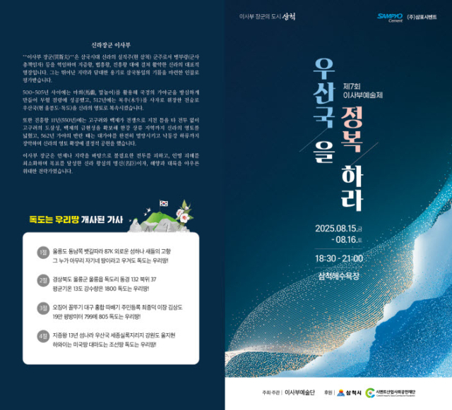 이사부 장군의 해양개척정신과 우리나라 고유 영토인 독도의 역사를 주제로 하는 ‘제7회 이사부예술제’ 공연이 이사부예술단 주관으로 15~16일 삼척해수욕장에서 열린다.