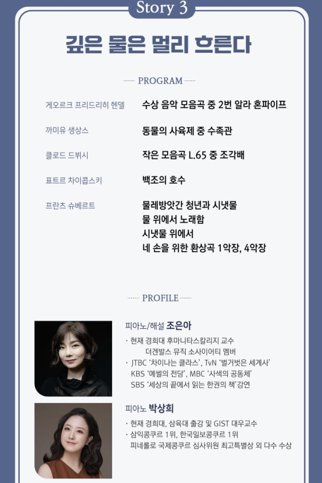 연주곡은 모두 ‘물’을 주제로 한 클래식 명곡으로, 헨델의 ‘수상 음악 모음곡’, 생상스 ‘동물의 사육제 – 수족관’, 드뷔시 ‘조각배’, 차이콥스키 ‘백조의 호수’, 슈베르트 ‘물레방앗간 청년’과 ‘물 위에서 노래함’ 등 다양한 시대와 작곡가의 작품이 어우러지며, 수량의 움직임을 연상케 하는 선율은 청중에게 시각과 청각을 넘나드는 시원한 감각을 선사할 예정이다.