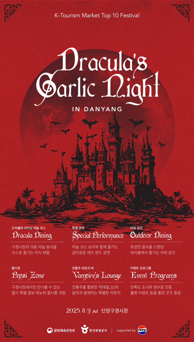 한국관광공사(사장직무대행 서영충)는 지난 9일 충북 단양의 ‘단양구경시장’에서 미식 축제 ‘드라큘라 갈릭 나이트’를 열고 이색 콘텐츠를 선보였다.