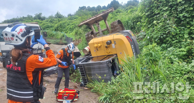 신고를 받고 도착한 소방대원들이 긴급히 굴착기 유리창을 깨고 중장비로 들어올려 구조에 나섰지만 굴착기 기사 A씨(52)를 살리기엔 이미 늦은 뒤였다.