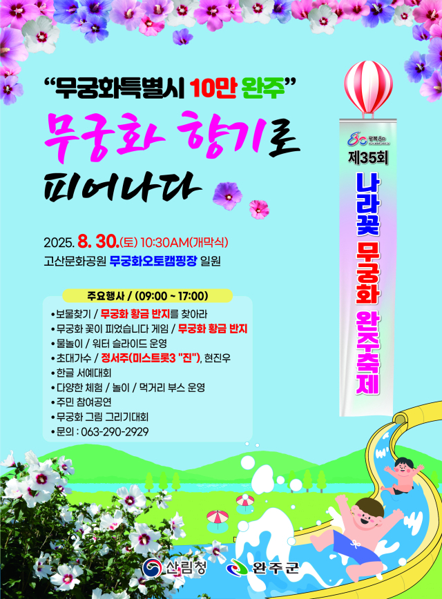 완주군은 오는 30일 고산문화공원(무궁화테마식물원 일원)에서 ‘광복 80년, 무궁화특별시 10만 완주, 무궁화 향기로 피어나다’를 슬로건으로 제35회 나라꽃 무궁화 완주축제를 개최한다고 20일 밝혔다.