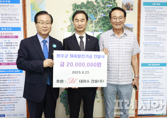 21일 대라수건설은 완주군체육회에 2000만 원의 발전기금을 전달했다. 기부금은 오는 9월 20일 열리는 ‘완주군수배 걷기대회’에 활용돼 군민 건강 증진과 생활체육 활성화를 위한 밑거름이 될 예정이다.