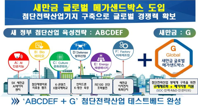 전북도는 정부의 6대 전략산업(ABCDEF)에 ‘G(Global Mega Sandbox)’를 더한 ‘ABCDEF+G 새만금 비전’을 내놓았다.