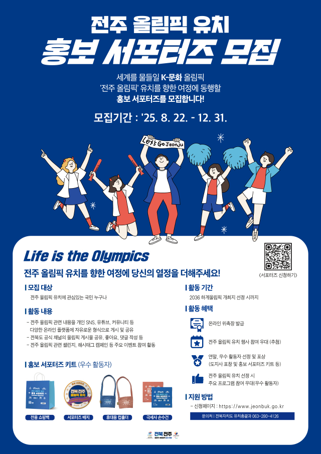 모집은 8월 22일부터 12월 31일까지 진행된다. 전주 올림픽 유치에 관심 있는 국민이라면 누구나 신청할 수 있으며, 전북도 누리집에서 본인 인증 절차를 거쳐 등록하면 된다.