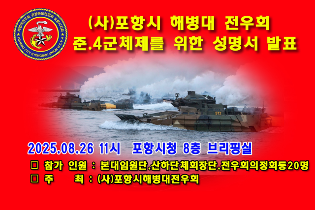 (사)포항시 해병대전우회가 해병대의 ‘준(準) 4군 체제’ 전환 실현을 위한 핵심 과제로 포항 해병대 1군단 창설을 공식 촉구하고 나섰다.
