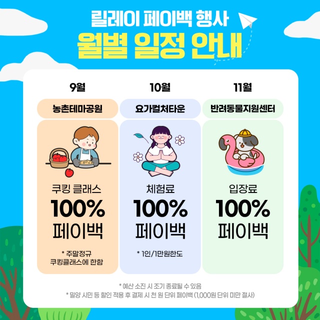 밀양시는 오는 9월부터 11월까지 ‘선샤인밀양테마파크 릴레이 페이백 행사’를 운영한다고 29일 밝혔다.
