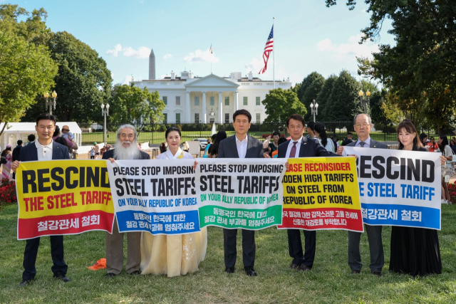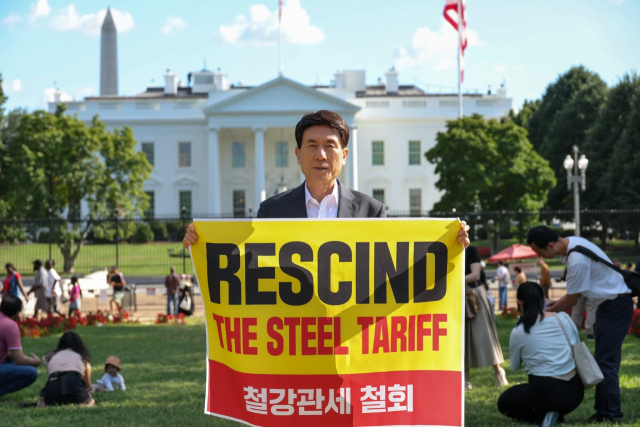 이강덕 경북 포항시장이 1일 미국 워싱턴 D.C. 백악관 앞에서 철강산업의 위기를 알리며 고율 관세 철폐를 호소했다.